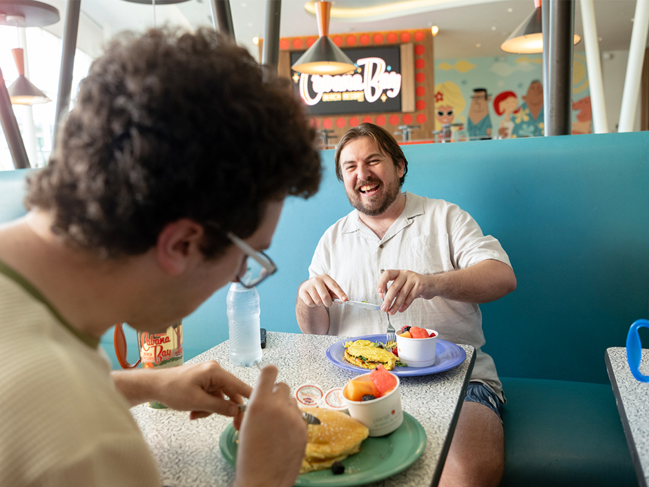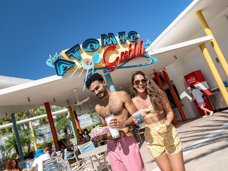 No tienes que dejar las áreas de la piscina cuando te dé hambre. Estos puntos de comida son perfectos para el almuerzo y la cena, con opciones a la parrilla, sándwiches, pizzas, ensaladas y bebidas para mantenerte fresco. Fíjate en los detalles fuera de este mundo de Atomic Tonic, que hacen referencia a los días de gloria de la Costa Espacial — ¡un toque excelente!